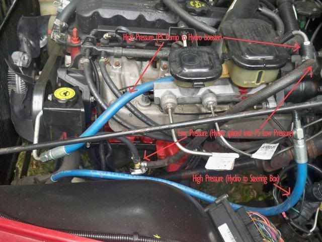 These are a compbination of the donor hoses and your old steering hoses. There is a diagram on cjoffroad.com for full plumbing.