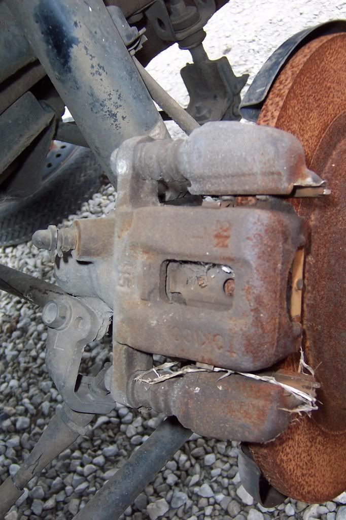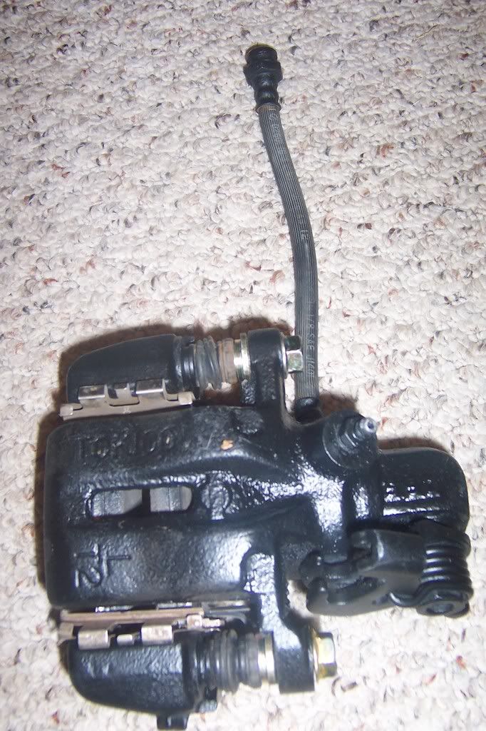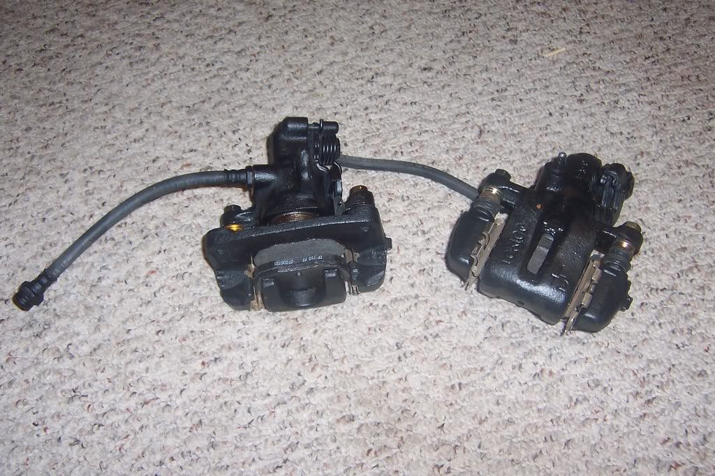 A set of brake callipers from an 84-86 Nissan 300ZX. I have heard other Nissan models of the same era use these callipers but I have not confirmed this. This is a good calliper to use because you can modify your e-brake cable and still have an emergency brake. I cut about a foot of the ebrake cable off the donor ZX to keep the old ends and mounting hardware.