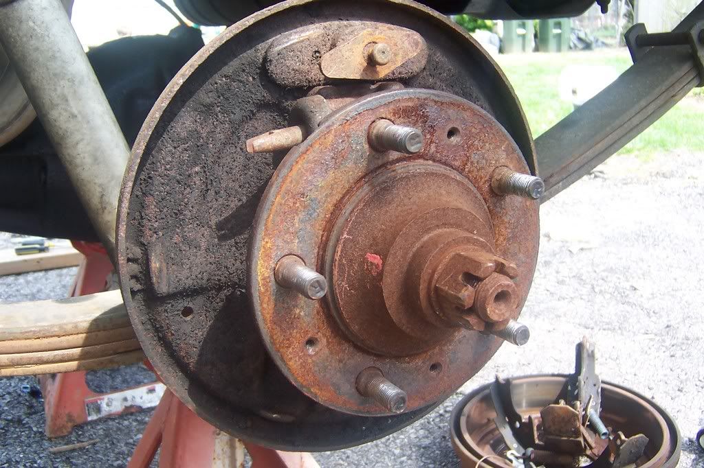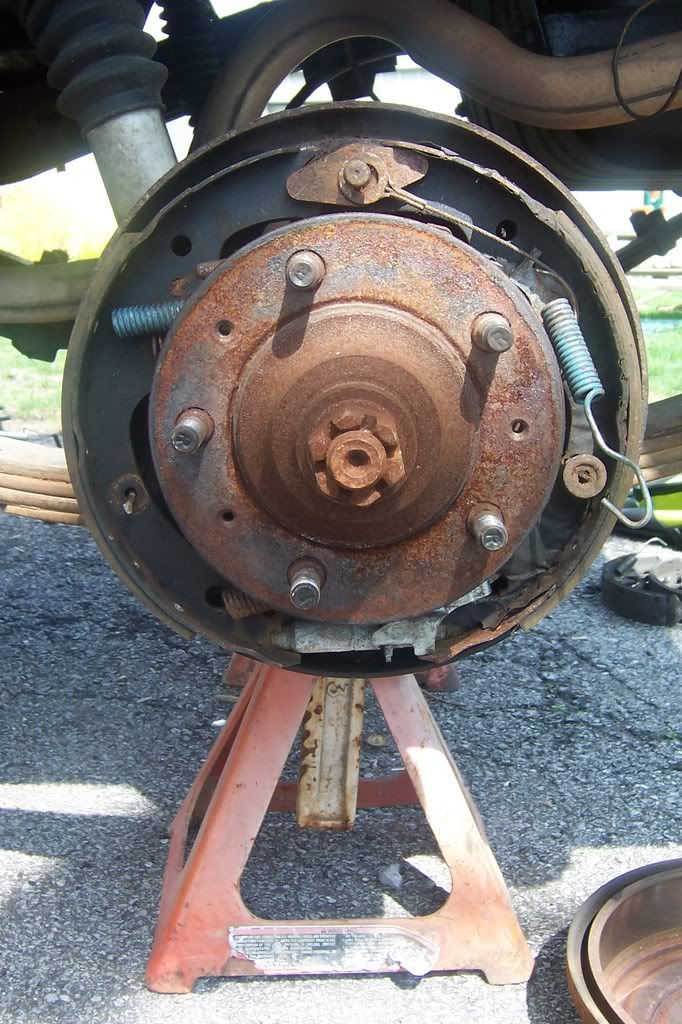 Take the tire and brake drum off. Dismantle all the brake components and remove old emergency brake cable. Once all brake parts are out remove the four bolts holding the backing plate to the axle housing. After removing bolts take out the old axle. Some screw the brake drum on backwards and use it as slide hammer to get the axle shaft out. I just put my tire back on with a couple lug nuts and kicked the backside of it. Slid out easily. Keep the backing plate and old shims.